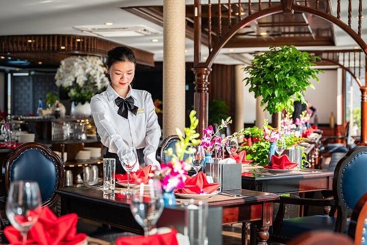 Luxury Cruise to Halong & Lan Ha Bay – 3 Days 2 Nights is the perfect choice for those seeking a blend of modern comfort and traditional charm. Our cruises offer a luxurious journey deep into the natural wonders of Lan Ha Bay, Halong Bay, and Cat Ba Island, featuring exciting activities like kayaking, swimming, and biking. This exclusive 3-day, 2-night itinerary includes a quick 2.5-hour limousine transfer from Hanoi via expressway (saving you time compared to the usual 4 hours), a unique route to explore both Halong and Lan Ha Bay, and unforgettable experiences such as sea bathing, squid fishing at night, and watching stunning sunsets and sunrises. All cabins come with private balconies that connect you with nature. Enjoy top-notch service from our professional and enthusiastic crew onboard.