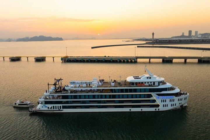 Embark on a 5 Star Luna Cruise Halong Bay Day Trip from Halong International Port, where luxury meets breathtaking scenery. Sail through the UNESCO World Heritage site of Halong Bay aboard Vietnam’s first cruise featuring an outdoor glass-bottom pool, panoramic 360-degree sundecks, and two lavish restaurants serving nearly 100 premium dishes. Explore iconic attractions such as Sung Sot Cave, Titov Island, and Hang Luon Cave by kayak or bamboo boat. With world-class facilities, gourmet dining, and live entertainment, Luna Cruise offers the perfect blend of adventure, culture, and relaxation for an unforgettable day in Halong Bay.